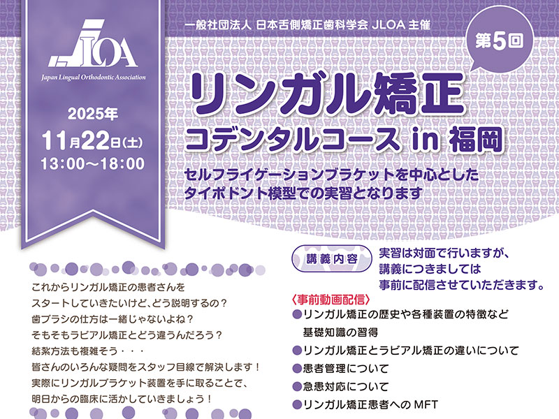 コース2023年度に新たに第1回目として迎えたリンガルベーシックタイポドントコースですが、今年はさらに講義内容をブラッシュアップし、リンガルブラケット矯正法のエッセンスをよりわかりやすく網羅しました。各治療ステージを想定した模型実習も、経験豊富なインストラクターがやさしく丁寧にレクチャーいたします。これからリンガルを始める方や、すでに初められている方にもお役に立てる内容です。皆さまのご参加をお待ちしています。